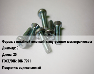 Винт с потайной головкой, с внутренним шестигранником 5х20 DIN 7991 оцинкованный, 8.8, цена за шт, кг цена от 2.28 Тг / кг, где купить, условия доставки в Актау и Мангистауской области