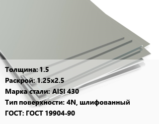 Лист нержавеющий 1.5 1.25х2.5 Сталь: AISI 430 Тип:4N, шлифованный ГОСТ 19904-90
