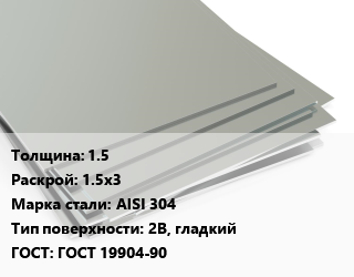 Лист нержавеющий 1.5 1.5х3 Сталь: AISI 304 Тип:2B, гладкий ГОСТ 19904-90
